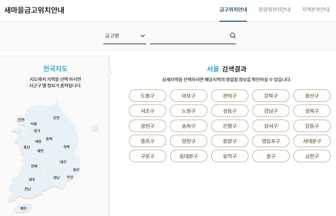 홈페이지에서 확인할 수 있는 지점 안내입니다. 금고와 중앙회, 지역본부의 위치를 금고명과 지역을 통해서 간편하게 검색을 하실 수가 있습니다.
